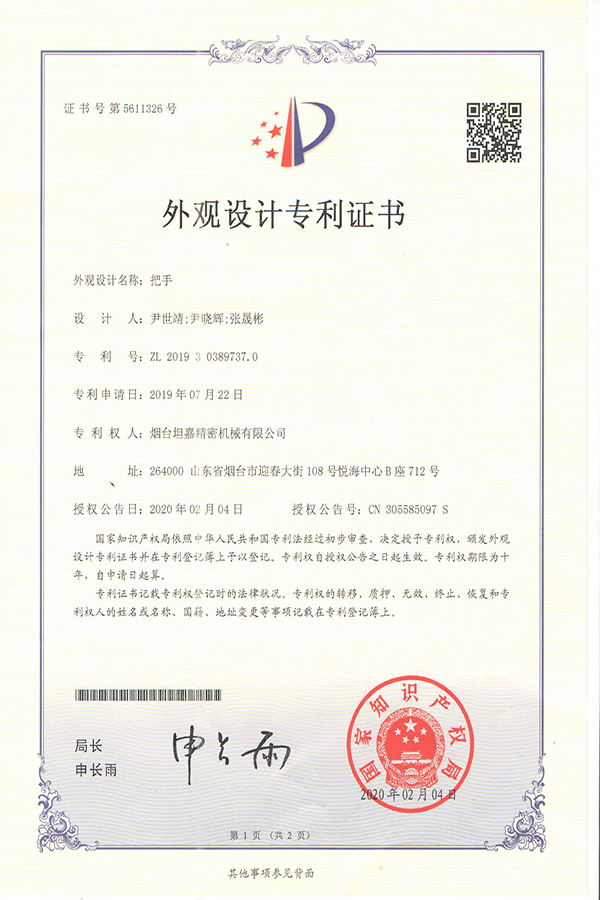 坦嘉精密于2020年2月4日,把手L43外觀設(shè)計(jì)專利順利通過國(guó)家知識(shí)產(chǎn)權(quán)局審查并獲得授權(quán),在公司團(tuán)隊(duì)不斷努力下,我司在產(chǎn)品自主設(shè)計(jì)和創(chuàng)新方面又一次取得專業(yè)性的突破。