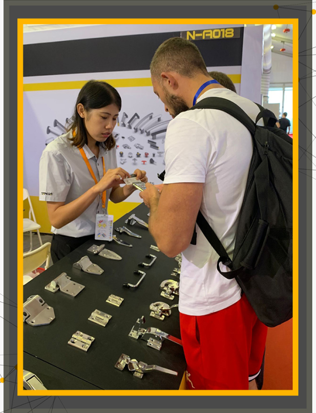 此次坦嘉攜帶多款自主研發(fā)的專利產(chǎn)品:不銹鋼搭扣、鉸鏈、門配、旋鈕、磁力夾具、把手及各種操作件等產(chǎn)品盛裝出席。