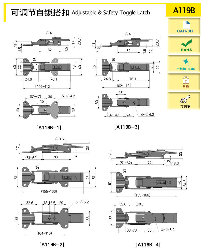 A119B-3 | 102-112 | SUS304 | 77.6 | 500 | 1500 | 可調(diào)節(jié),自鎖 | 下載 |