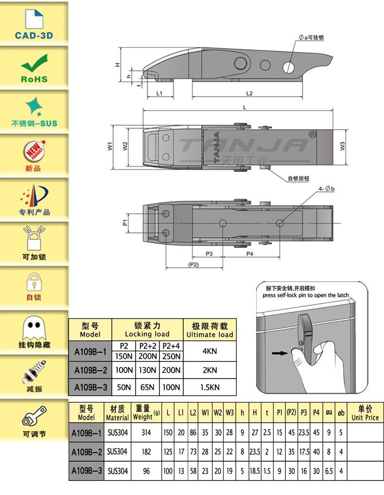 | A109B-1 | 150.4 | SUS304 | 322.59 | 250 | 4KN | 內(nèi)扣式,自鎖,減振,可調(diào)節(jié) | 下載 | ||||