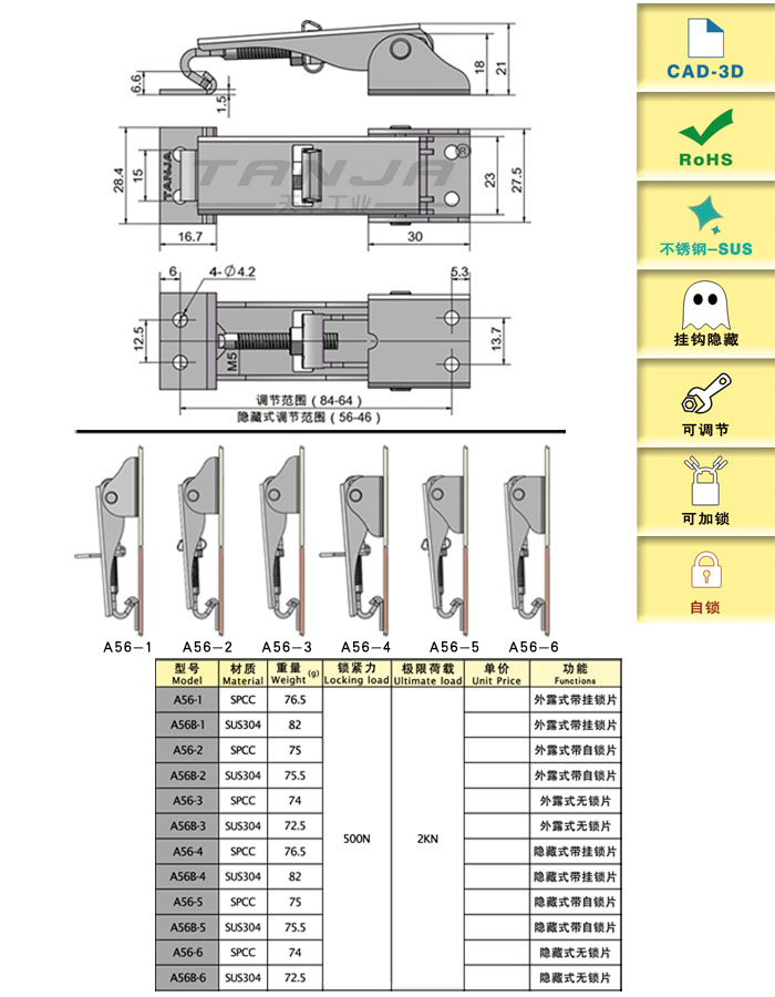 | A56-4 | 81.4 | SPCC | 76.93 | 500 | 2000 | 內扣式,可調節(jié),帶鎖 | 下載 | ||||