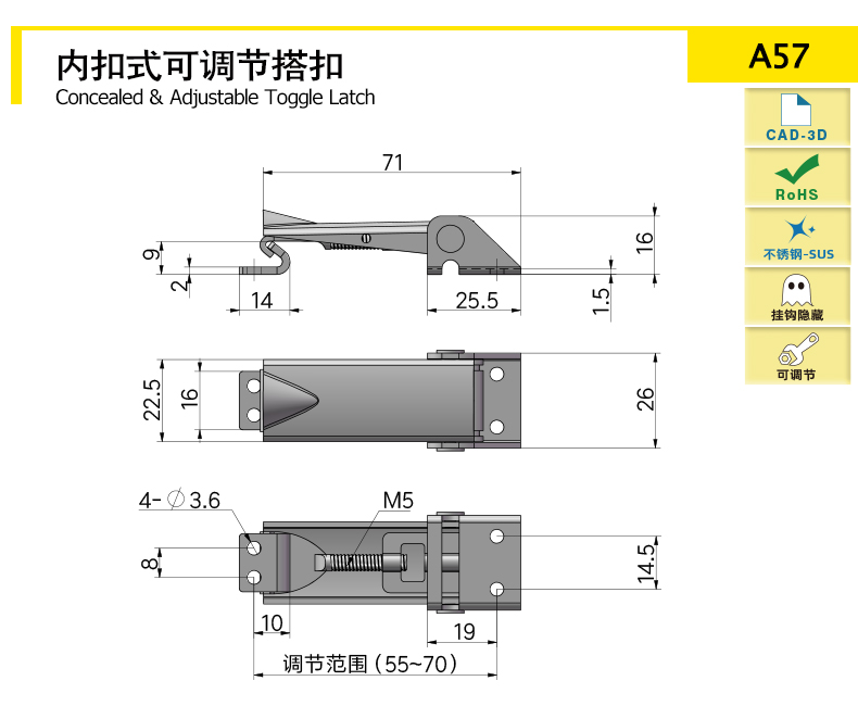 內(nèi)扣式機(jī)構(gòu),能夠在手柄下面隱藏所有安裝硬件和鎖定功能,下偏心機(jī)構(gòu)可實(shí)現(xiàn)牢固的偏離平面鎖定