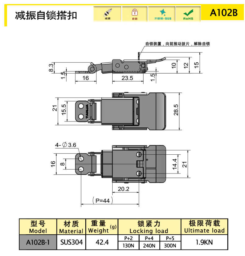 搭扣獨(dú)特的自鎖機(jī)構(gòu)設(shè)計(jì),防止搭扣在使用過程中彈開,使用方便安全