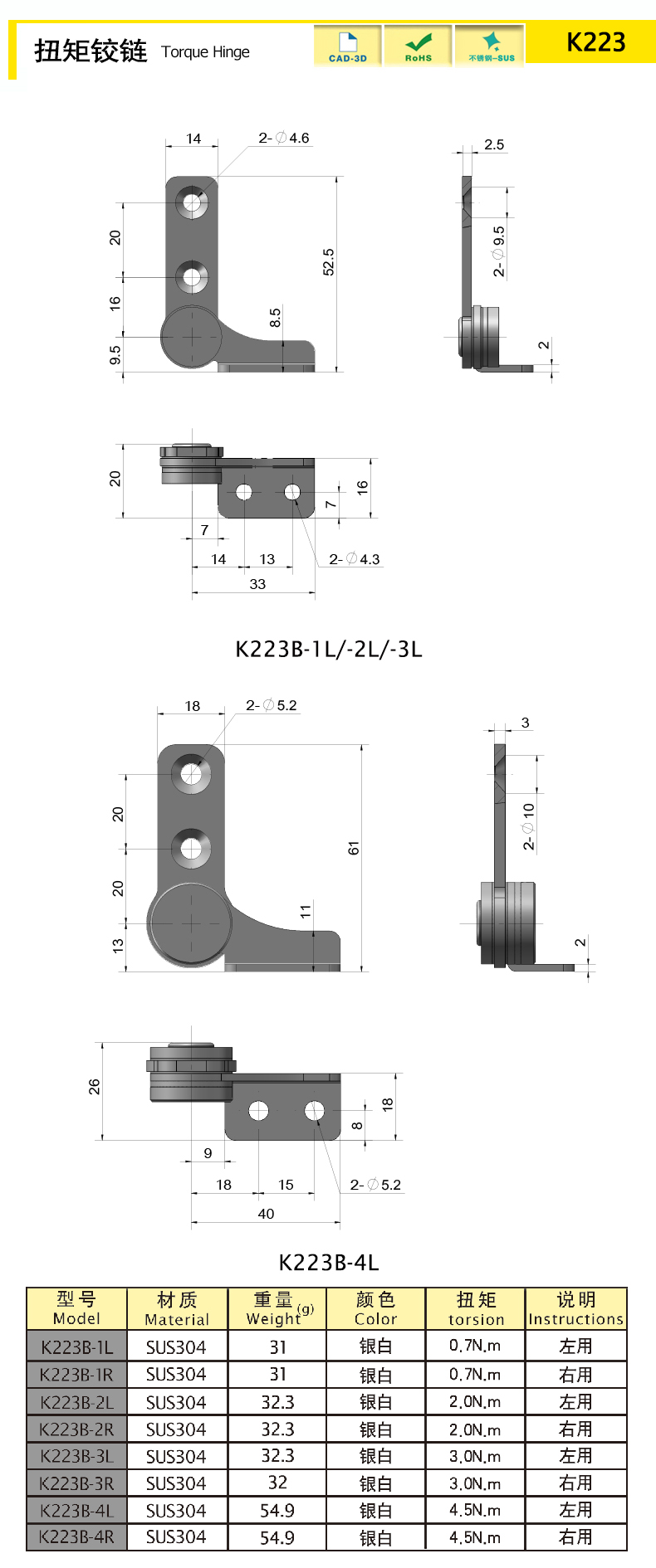 | K223B-4R | SUS304 | 銀白 | 54.9 | 固定扭矩 | 下載 |