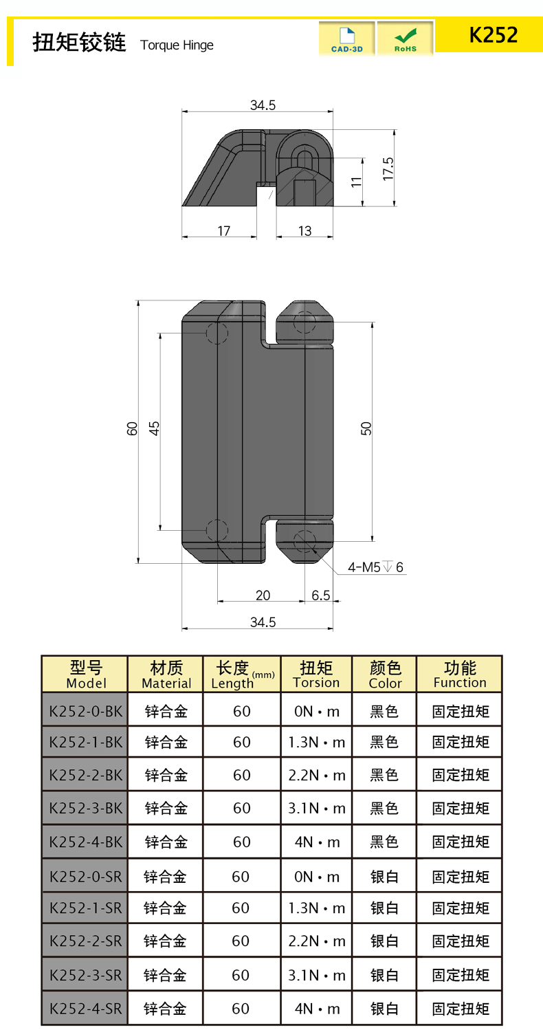 | K252-4-BK | 鋅合金 | 60 | 黑色 | / | 固定扭矩 | 下載 | ||||
