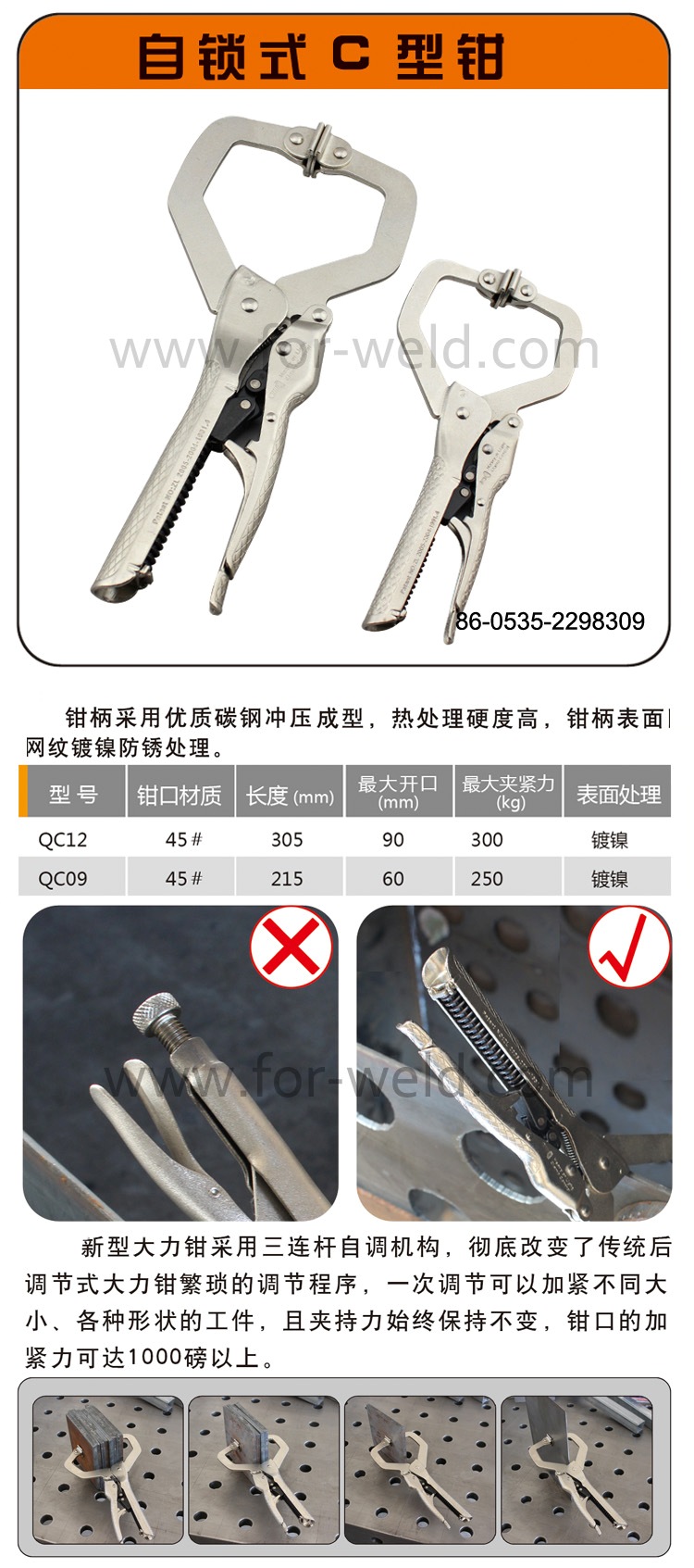 新型大力鉗采用三連桿自調(diào)機(jī)構(gòu),改變了傳統(tǒng)后調(diào)節(jié)式大力鉗繁瑣的調(diào)節(jié)程序,一次調(diào)節(jié)可以夾緊不同大小、各種形狀的工件,且夾持力始終保持不變,鉗口的夾緊力可達(dá)1000磅以上。