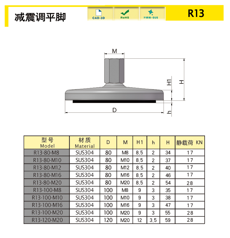 | 型號(hào) | 材質(zhì) | 直徑D | M | H | h | H1 | 重量(g) | 靜載荷(KN) | 3D圖紙 | 選購(gòu) | |||