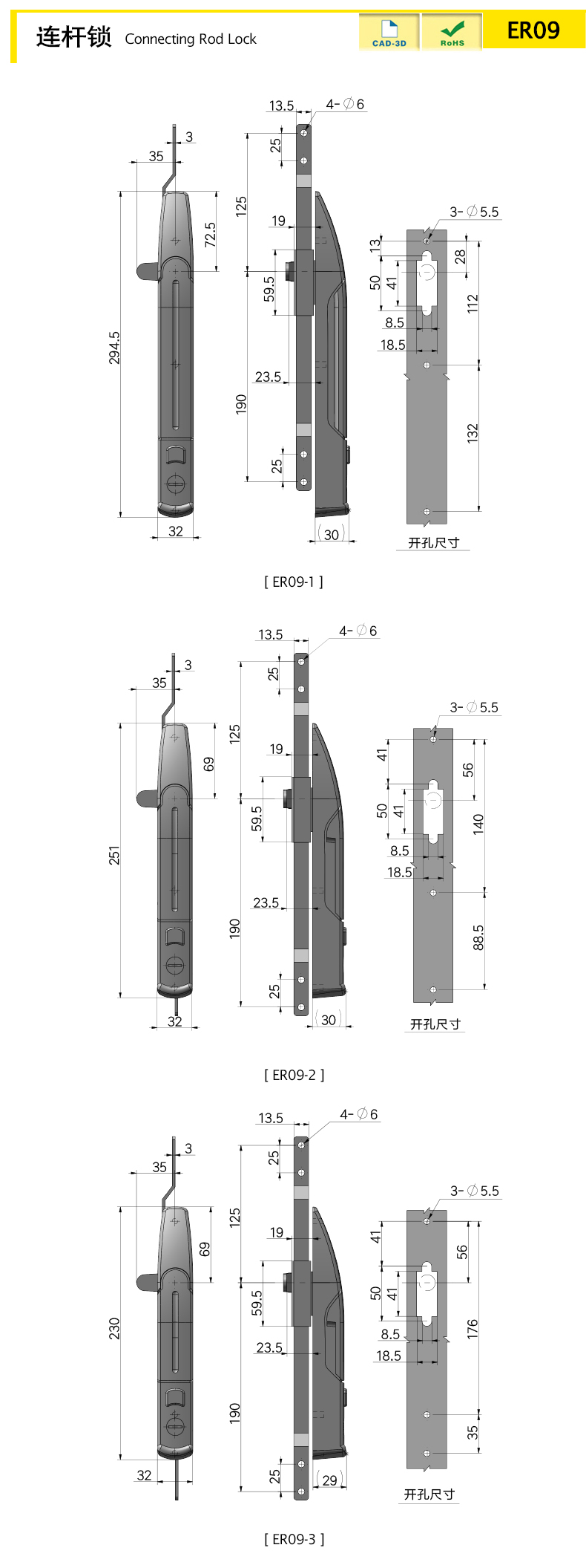 上下兩根連桿配合鎖舌一起工作,機(jī)箱機(jī)柜的柜門形成了三處受力點(diǎn),鎖緊效果牢靠,且門板不容易晃動(dòng)